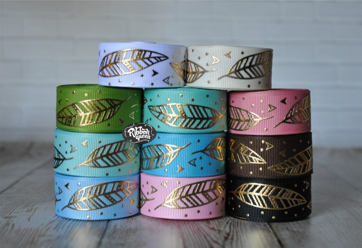 5 yards 7/8" Gold Foil Feather Print Grosgrain Ribbon
