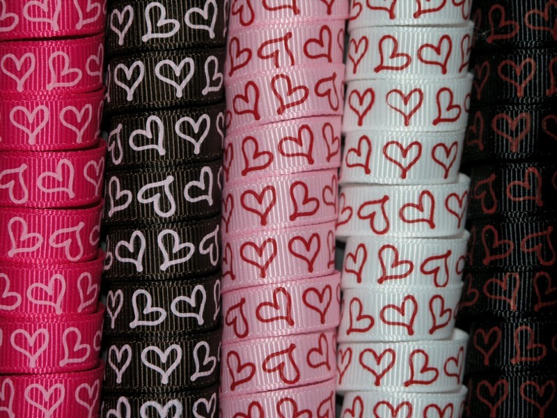 Hearts are printed on one side and reverse to corresponding solid ribbon. Hand washing is recommended to keep them bright, low iron on opposite side. Hearts may show wear from heavy handling as any print would. 100% Polyester.