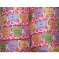 A classic Valentine's Day candy has found it's way onto this adorable cheetah ribbon. Conversation Hearts in Yellow, Orchid, Peach, Apple Green, and Blue are outlined in Shocking Pink on a background of Lt. Pink & Hot Pink Cheetah spots. Hearts read: Be Mine, Love You, True Love, Hugs & Kisses, and Cutie Pie.