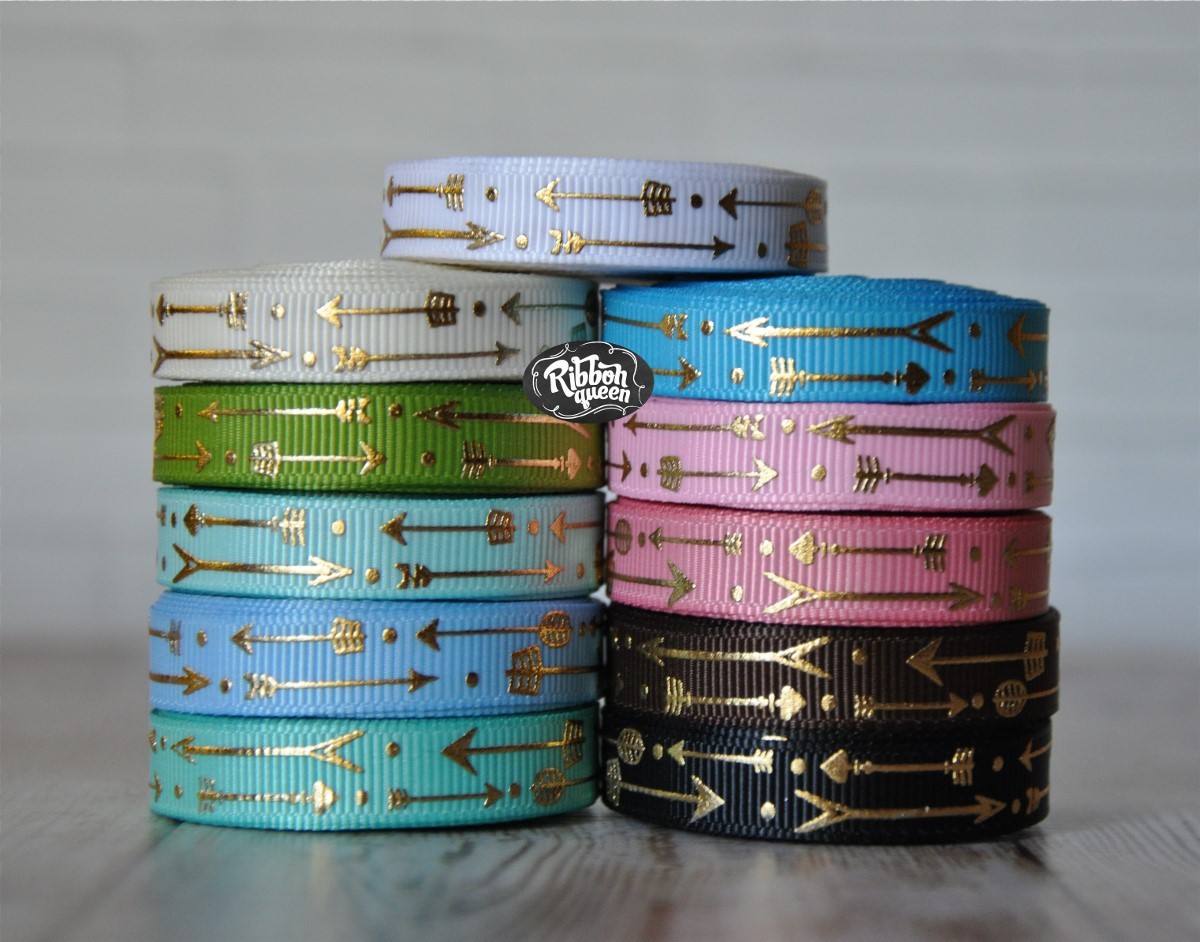 5 yards 3/8" Gold Foil Arrow Print Grosgrain Ribbon