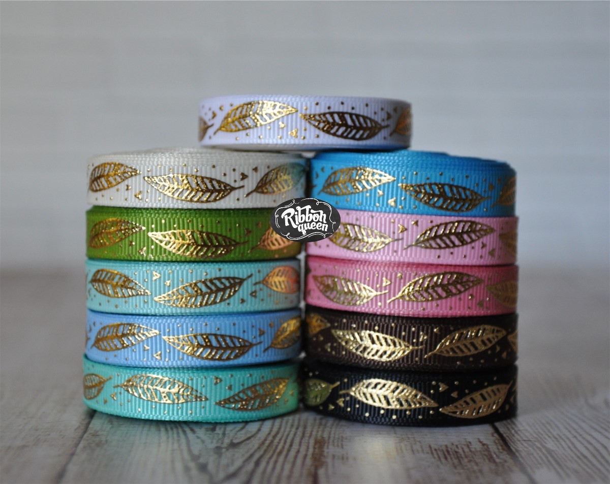 5 yards 3/8" Gold Foil Feather Print Grosgrain Ribbon